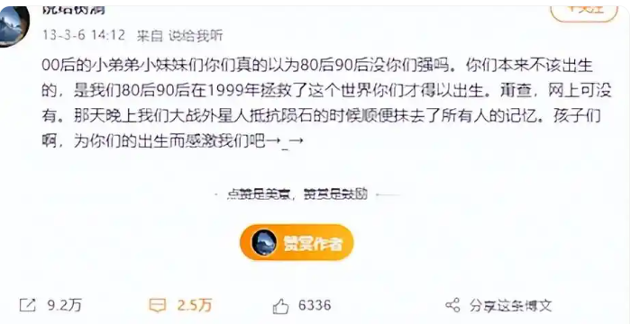 看到这里,应该有不少人觉得啼笑皆非吧,接下来就让我们还原1999年地球保卫战的真相,时间回到2013年,当时的00后正值叛逆期。由于从小被宠爱,许多孩子开始在网上炫富,并在学校中表现出不尊重长辈、做坏事的行为。这些举动引起了许多80后和90后的反感。于是,一些聪明的网友想出了一个损招,他们编写了一个关于人类与外星人大战的故事,强调前辈为拯救地球而牺牲的情节,以此来劝说部分00后改正自己的行为。原文中提到,如果没有80后和90后的付出,地球早就被毁灭了,00后根本无法来到这个世界。随后,原文还表示这个故事的真相已经被消除,参战人员也签署了保密协议,因此零零后们无需了解真相。这段话一经发表,立即引起了无数80后和90后的狂欢。他们借此机会疯狂改编人类大战外星人的故事,甚至编写了战友们的嘱托,使得整个故事看起来更加真实。随着热度的累积,一些网络红人也加入了这场战斗,他们利用自己的影响力和传播力,进一步推广了人类大战外星人的故事。
